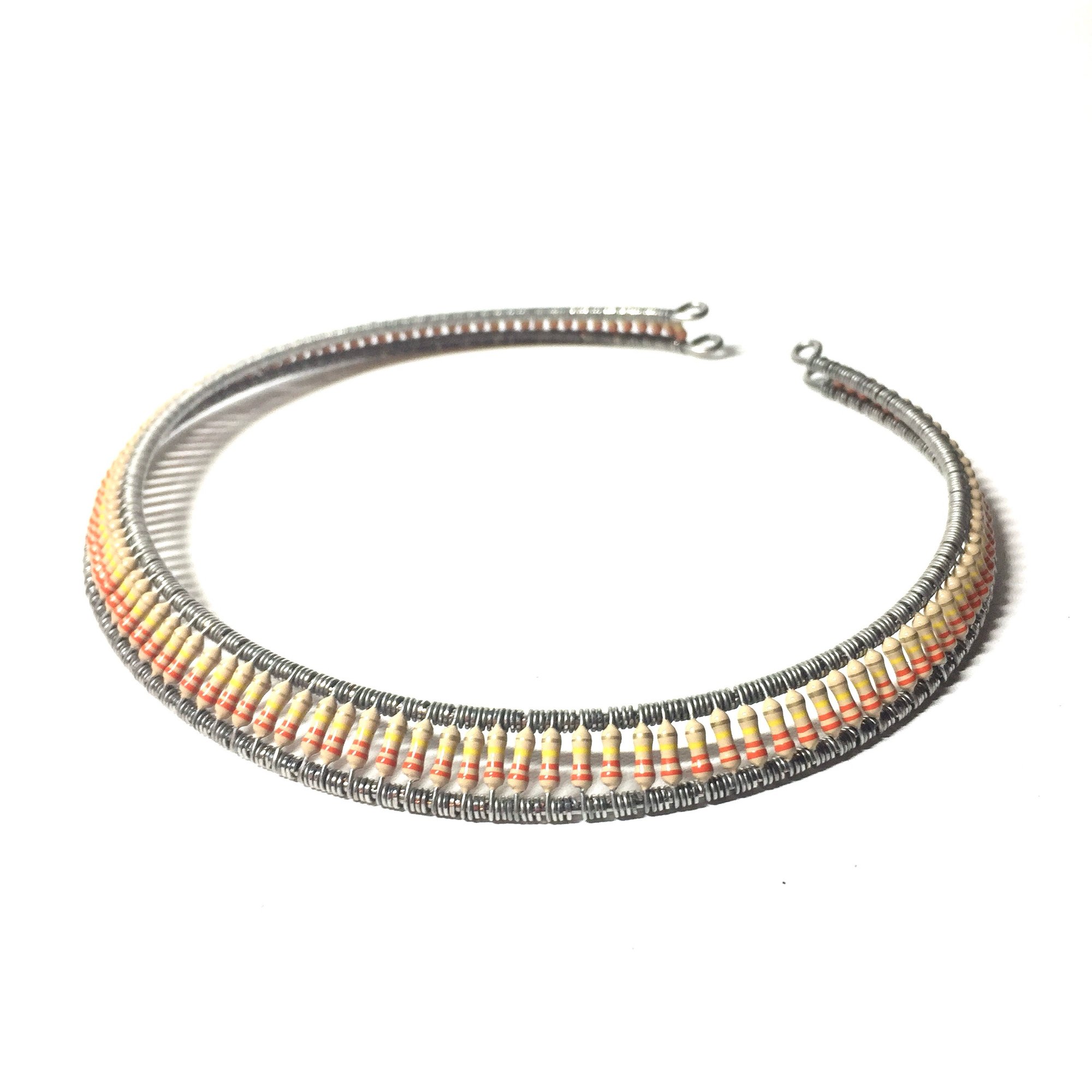 The RESIST collection is created from surplus resistors, transistors and diodes collected from various recycling centers and individuals. The resistors are wound one by one on to steel wire, or the ends (leads) are each snipped and looped to be attached together by stainless links.