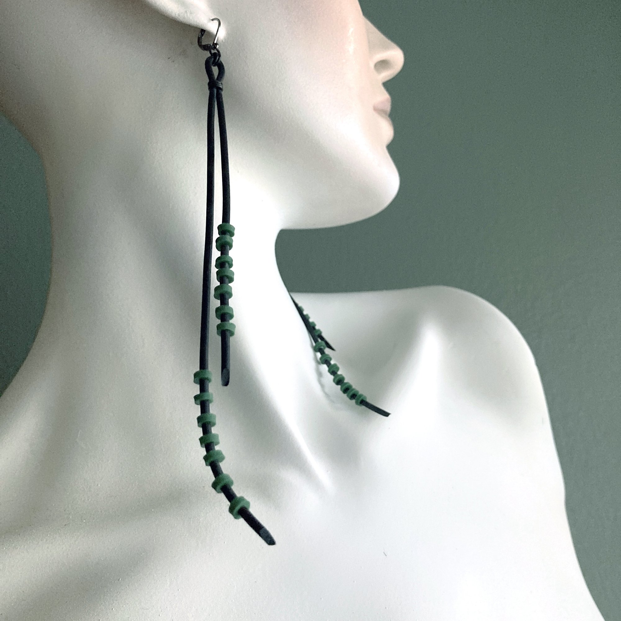 These are from a collection made from upcycled o-ring cord. The green accents are from the rubber labels of EFFEN Vodka bottles, recycled from the Metro